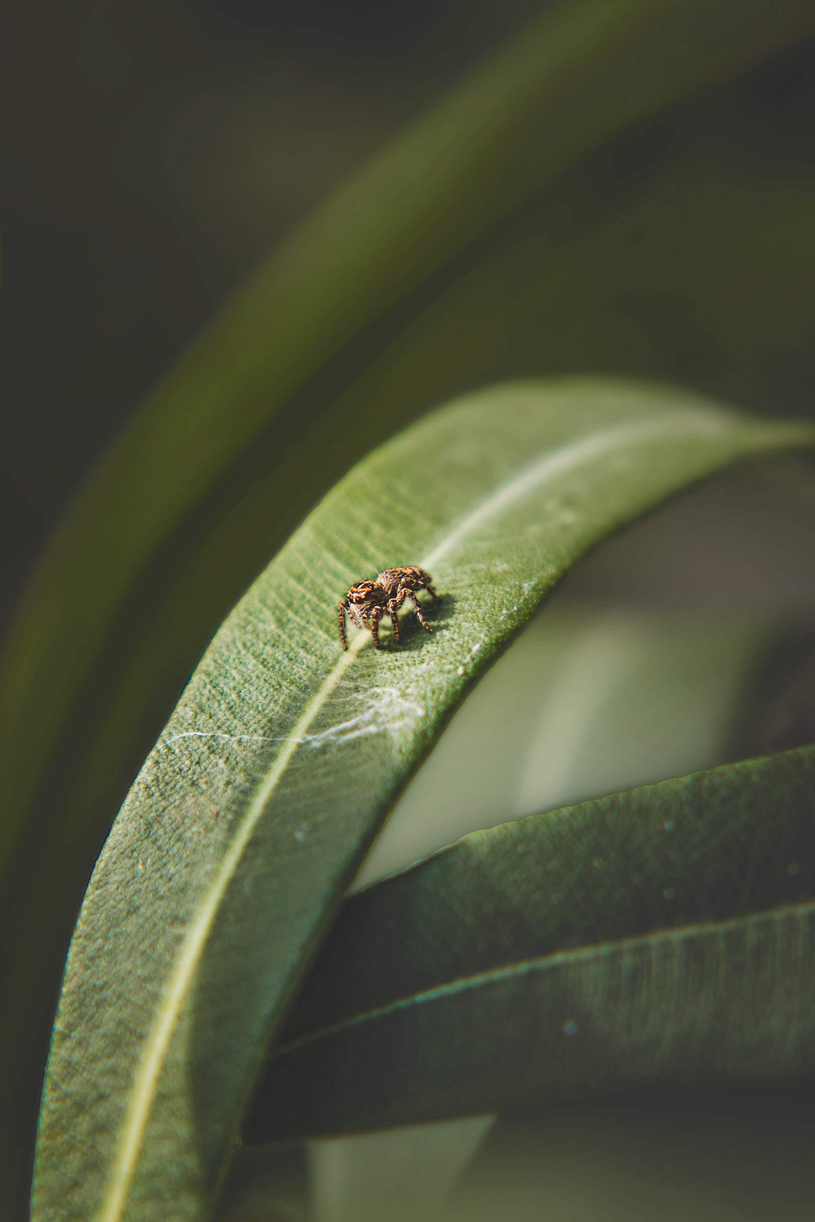Jumping spider hunting on leaf